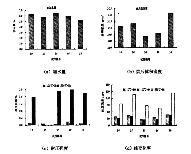 按照設計配比將骨料和高溫氧化鋁粉配料混合,加入適量水攪拌直至具有合適的流動性。在室溫下振動成型(測定物理性能的試樣尺寸為40mmx40mmx10mm及50mmx50mm×50m),自然養護24h脫模,放置48h后,進行110℃x24h烘干處理。分別于1100℃和1550℃保溫3d燒成。按照相應的國標行標檢測各項指標。
